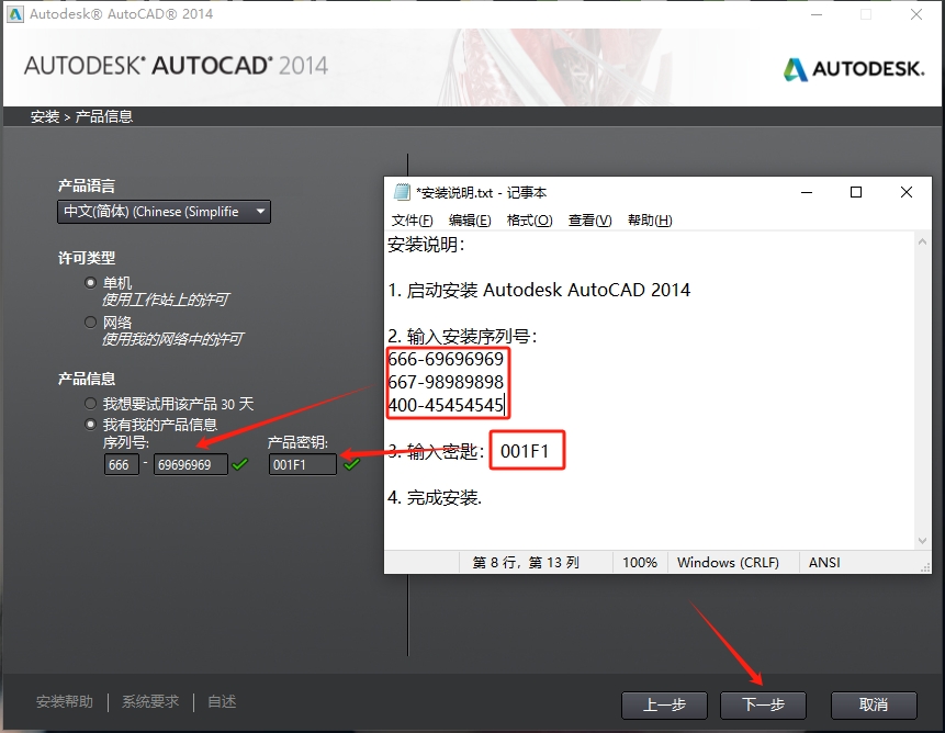 8、依次输入序列号和产品密钥,点击【下一步】。