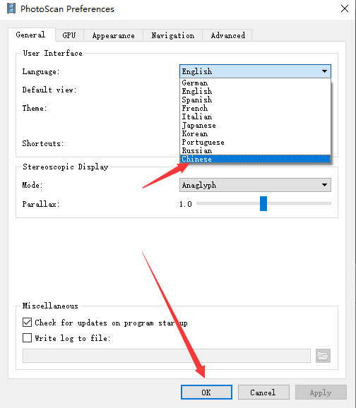 3、在photoScan Preferences窗口中,点击“Language”后面的“English”下拉列表选择“Chinaese”;