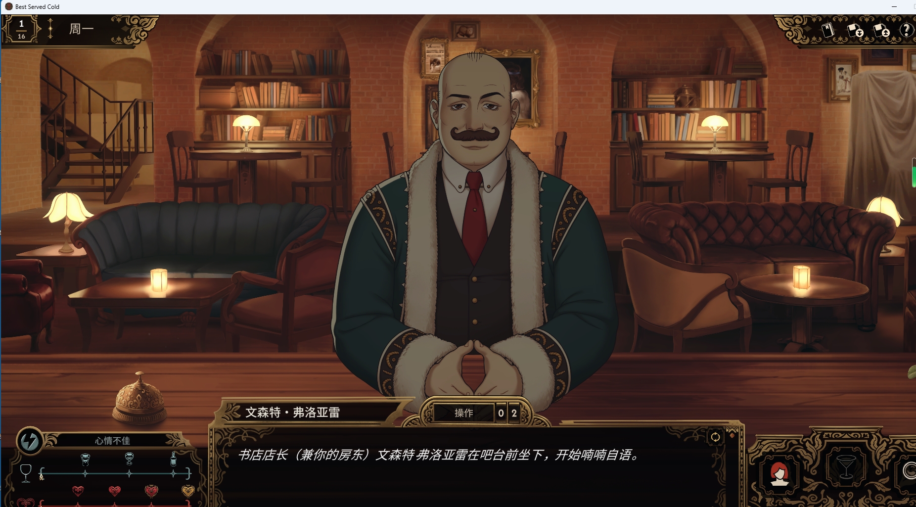 玩家需平衡酒吧经营(调酒效率、资源分配)与案件调查,连续失误会触发卫生检查或黑帮勒索等随机事件。夜间推理阶段有时间限制,超时将直接导致游戏失败。