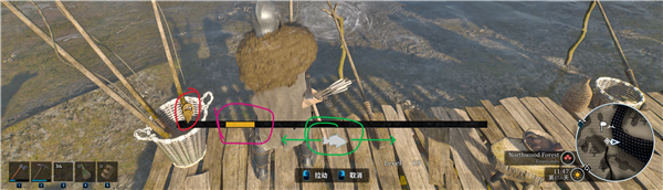 如下图,钓鱼小游戏有3个部分,红圈坐标点和紫圈的黄条是游戏互动区,绿圈鱼图标为进度。