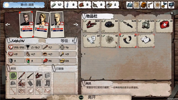 游戏开始时玩家需要自己创建角色,选择武器、职业和能力等,近战武器方面凭玩家个人喜好自行选择,远程武器建议选择霰弹枪,手枪输出较低,步枪子弹较难获得,霰弹枪子弹量适中,且拥有较好的控制技能和AOE;职业建议选择技师,技师可以建造营地设施,在前期营地管理中较为重要;能力建议选择制作,可以保证前期子弹有稳定来源。