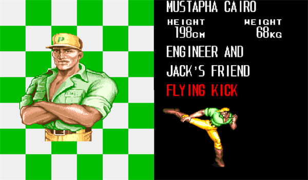 杰克的好友,头戴黄帽,身穿绿上衣黄裤子,童年最火的角色肯定是他。跑动中可以双脚踢人,跳跃中用脚攻击敌人。绝招是翻身腿。实用性最强,速度最快,攻击力也不差,各种攻击尤其是跑动攻击和绝招使其能有效对付空中或地面的敌人。综合能力是四个人最强的。属于敏捷偏平衡型;