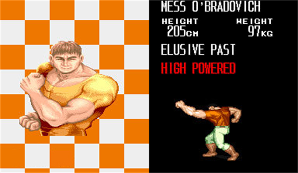身穿红上衣绿裤子,肌肉发达。跑动中用双臂攻击敌人,跳跃中可以用脚或拳头攻击敌人。绝招是流星拳。速度最慢,但是攻击力最强,攻击动作很有魄力,血少点的敌人几乎可以三拳一摔秒杀属于力量型。