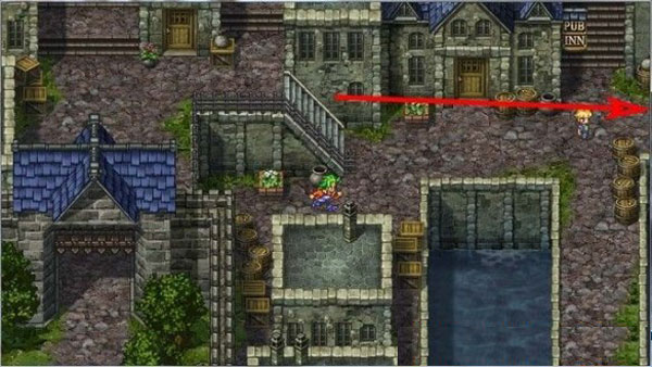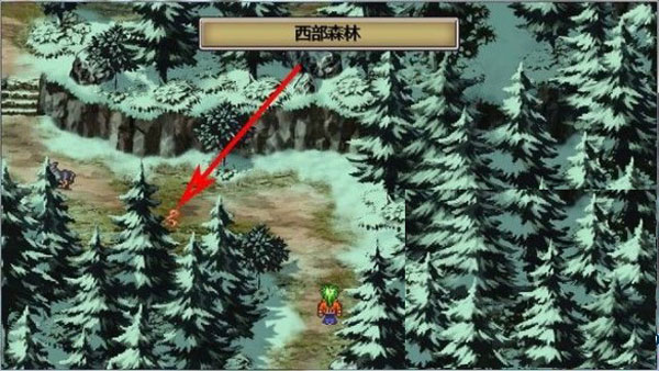 在城镇的东北,如下图箭头所指,这里有一条路可以通向大地图,首先,我们进入西部森林。