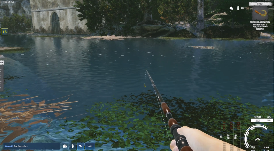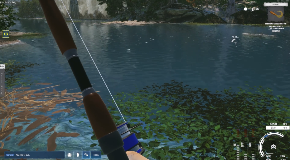 抛竿后,切图到水下视角,然后按Z切图水下视角模式,拉线速度设22%(拉直到钩变绿为有效,然后注意看鱼追饵)。PS:观察到鱼追饵了,CTRL拉满速度(开始溜鱼),注意看自己右下方的鱼线距离,溜到30米左右就让鱼咬钩,基本1分钟之内轻松上鱼-这是拉大鱼的关键技巧!不然你斗鱼时间会很长,而且不见得是上的大鱼。