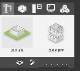当你选择了建造模式时,就能通过图中各项图标进行从地基到门窗到设备的建设、布置。
