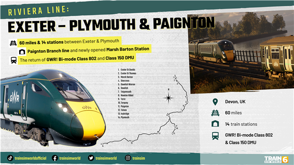 行驶于大名鼎鼎的里维埃拉线,沿着德文岸滩快速前行,并在道利什海堤自由翱翔!驾驶大西铁路列车前往田园诗般的英国沿海城镇,登上“城际列车” 802 型动车组和“短跑手” 150/2 型动车组往返于埃克塞特、普利茅斯和佩恩顿之间。