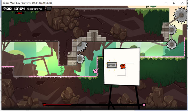 超级食肉男孩永无止境(Super meat boy forever)是由Team Meat公司制作发行的一款横版闯关类动作冒险游戏。本作是Super Meat Boy的续集,玩家将在熟悉的地点和全新的世界中奔跑、跳跃、拳打脚踢,同时享受一个真正适合大屏幕的故事。在本作玩家肉男孩将和绷带女孩一起进行冒险,你们将要不断的奔跑、滑行、跳跃、猛击并踢过7,000多个关卡,才能从费图斯博士那里救出他们的女儿金块。超级食肉男孩永无止境电脑版依旧继承了关卡极为困难无情的特色,玩家在游戏中死亡不可避免,或许死亡将会让您习惯,而你要做的就是在无尽的死亡中变得更强,熟悉关卡的每一个细节你才能够顺利通关。超级食肉男孩永无止境游戏玩法简单,但是想要在这些复杂的关卡打出简单的操作都是一件困难的事,所以你需要不断的训练手速和训练你的反应能力,游戏的画面会给你不错的惊喜,像素风格的游戏画面呈现给玩家非常多的细节,比如你在抓住某些东西回事殴打某些东西是画面颜色会随着变动。相信有很多的朋友已经期待这款游戏很久了,所以你能够通过这七千多个关卡吗!