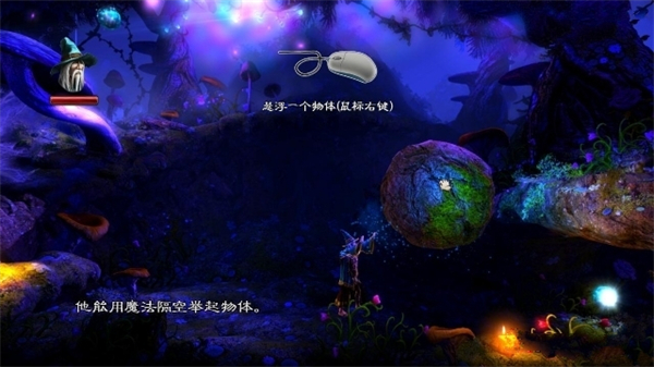 1、游戏开始的动画几句话带过一代的剧情,然后场景转到魔法师的房间,按WASD移动,向右走出来房间,来到这种需要跳着过去的地方按W或者空格,按的时间越长跳得越高,跳到前边的水坑里,踩着浮起来的气泡跳到对面平台上。