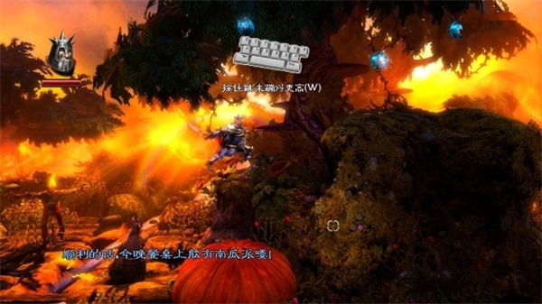 4、移动和法师一样,左键用剑攻击,右键用盾牌防御,砍死一些植物后跳到这个南瓜上,这南瓜就像蹦床一样,可以帮着勇士跳得更高。
