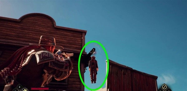 6、继续前进,手推车右侧建筑上挂着一具尸体,用枪把它打下来,拿到30钱。