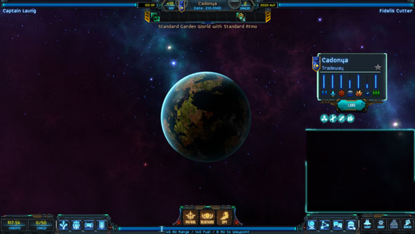 星际贸易前沿采取一个清新简洁的界面,并没有真正的4X类策略运营的核心元素,但不多不少都有类似的风格。从上面的预览图就可以看到,左下依次排序的是信用额(钱)、货舱容量(货物)、任务、合约联络人、传闻、派系、飞船的燃料缸和空间跳跃所需要的燃料刻度(游戏内距离以燃料消耗平均值AV表示)