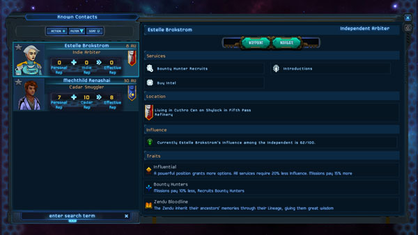 在降落行星前、玩家需要在轨道Orbit上决定应该往哪里降落(哪怕只有一个位置)、同时轨道上有巡逻PATROL(打击宇宙海盗和其他派系的敌对船只,提升对当前行星所属派系的好感度)、BLOCKADE(拦截商船和走私者,但会引来当前行星的军队注意)、间谍SPY(获得该区的情报,情报可以向部分合约联络人销售增加好感度,增加联络人提供的功能或任务报酬)。