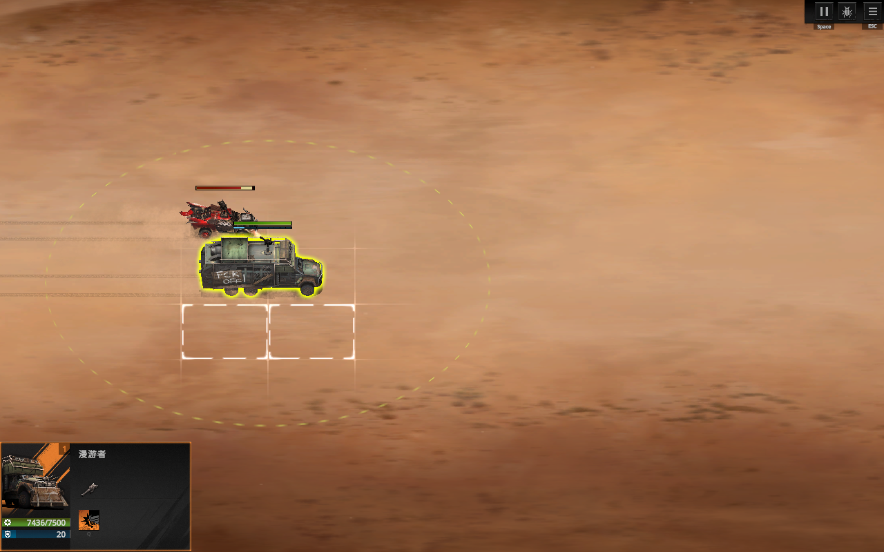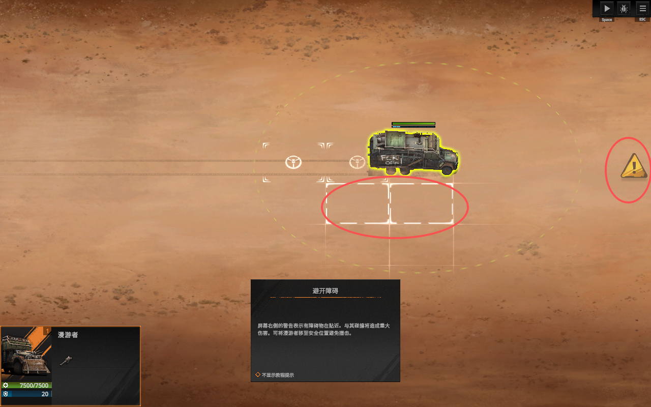 11、车辆周围的黄圈表示车辆武器的攻击范围,点击屏幕左下角的特殊标识,还可以发动技能“侧击”可以撞击战车两侧的敌军。