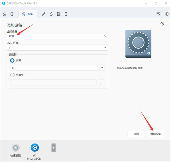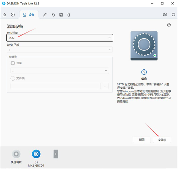 8、在虚拟设备中选择SCSI,点击安装,安装完成之后重启电脑,重复上述步骤3(装载MK2 GBCD1);