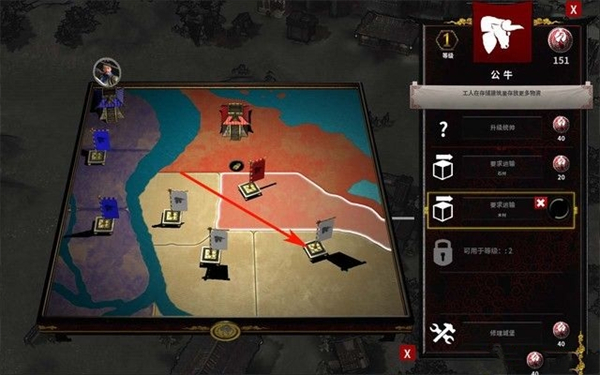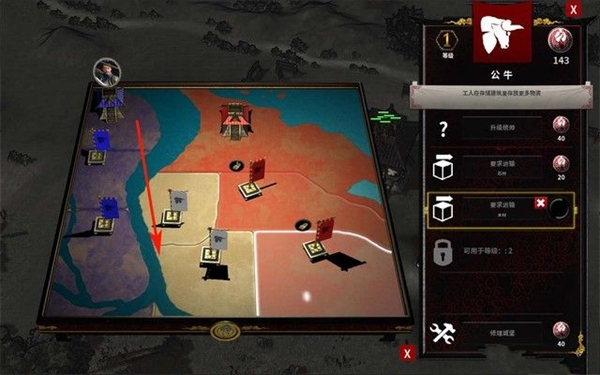 首先,招募一些近战兵,配合初始的士兵进攻如下图箭头所指的要塞,将其征服,这座要塞是次战的你的重点防御目标,需要安排大量的士兵再这防御,将敌人阻挡在河对岸。