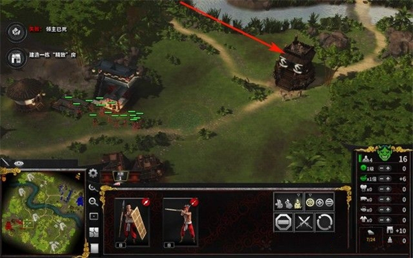 击退敌人的进攻后,我们就暴兵吧,如下图箭头所指,这就是兵营,建造初级的两种兵,以近战士兵为主,吹管兵可以少招一点。