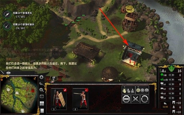 关于招兵方面,以海量的部落矛兵搭配一下后备斧兵为主,招募50个之后就可以去进攻南边的要塞了。