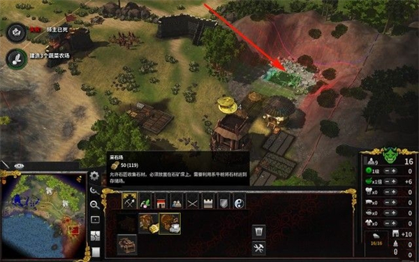 如下图箭头所指,将采石场建造在石材上,然后在旁边建造一个牵牛桩,只有建造了牵牛桩,并且采石场处于范围内,石材才会被运输到仓库,否则的话,石料收入为零。