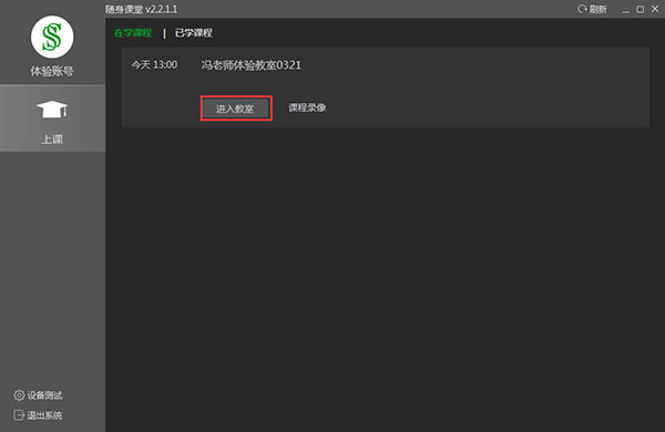 3、登录软件后,会显示自己所报名的班级列表,根据上课时间、班级名,选择进入正确的教室。点击【进入教室】按钮,即可进入当前班级教室,并开始上课。