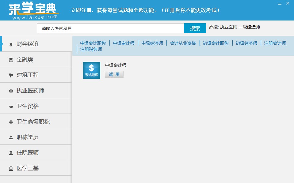 来学宝典电脑版对常考题、易错题进行重点分析讲解,软件还收录于考题题型一致的高仿真模拟试题,方便考生在学习之后巩固自身以及测验。海量的题库加上众多练习,让我们的考生能够很好的完成学习,如果你想要通过资格考试获得资格证书,那么这款软件是非常不错的学习选择。