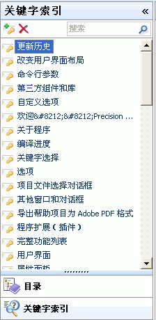 现在依次点击 Ribbon 栏工具下面的自动添加主题和自动添加关键字(这里的主题是指 CHM 文件左边目录中的目录项,关键字则是到主题文件的索引),根据提示进行操作到添加完成。然后点击左边导航栏中的目录和关键字索引后可以看到上方出现了刚才添加的主题和关键字:
