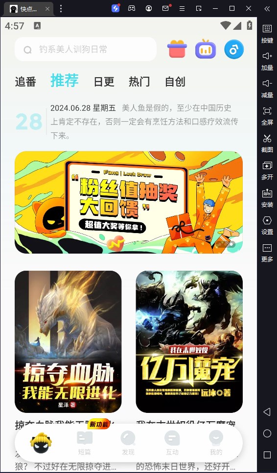 快点阅读电脑版是借助安卓模拟器而运行的一款小说阅读软件,该软件有着丰富的短片故事资源,让读者可以融入小说环境,使用过后便会超乎你对阅读的想象。同时它的操作界面非常简洁,直观大方,且排版非常的干净,没有任何的糟乱代码,没有多余的广告弹窗,只为用户营造出纯净式的阅读体验。