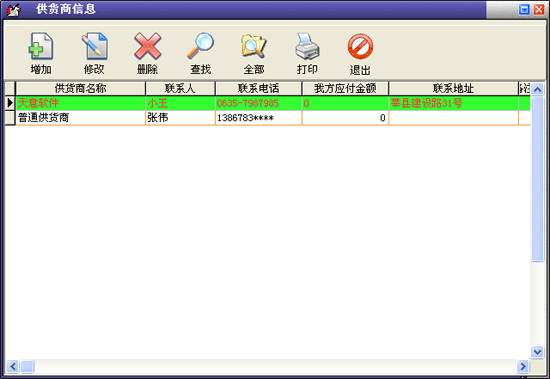 在基本设置模块中点击“供货商信息”按钮打开供货商信息窗口。在窗口中可以看到所有的供货商。点击“增加”按钮打开增加供货商窗口,输入供货商的信息,供货商名称不能重复。如果该供货商有期初金额就在“期初应收”后输入相应的金额。点击“修改”按钮可以修改选中的供货商信息。点击“删除”按钮可以删除选中的供货商,如果该供货商有业务发生则不能删除。系统有一个“普通供货商”是不能被删除的。点击“查找”按钮打开供货商查询窗口,输入相应的条件查询不同的供货商信息。点击“全部”按钮可以列出所有的供货商信息。