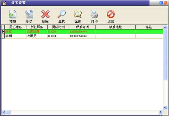 在基本设置模块中点击“员工信息”按钮打开员工信息窗口。在窗口中可以看到所有的员工。点击“增加”按钮打开增加员工窗口,输入员工的信息,员工名称不能重复。点击“修改”按钮可以修改选中的员工信息。点击“删除”按钮可以删除选中的员工。点击“查找”按钮打开员工查询窗口,输入相应的条件查询不同的员工信息。点击“全部”按钮可以列出所有的员工信息。