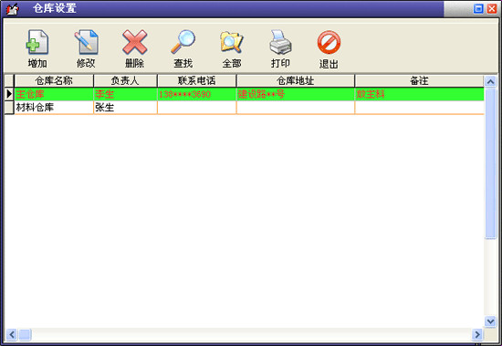 在基本设置模块中点击“仓库设置”按钮打开仓库设置窗口。在窗口中可以看到所有的仓库。点击“增加”按钮打开增加仓库窗口,输入仓库的信息,仓库名称不能重复。点击“修改”按钮可以修改选中的仓库信息。点击“删除”按钮可以删除选中的仓库。点击“查找”按钮打开仓库查询窗口,输入相应的条件查询不同的仓库信息。点击“全部”按钮可以列出所有的仓库信息。