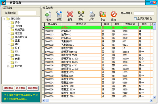 在商品信息窗口中左边是商品类别,右边列表中是该类别对应的商品。可以新增类别,重命名和删除类别。新增的类别是属于所选类别的下一级,如果类别下有商品存在则该类别是不能被删除的。在类别名称后的文本框中可以输入类别名称或类别简码来查询需要的类别。