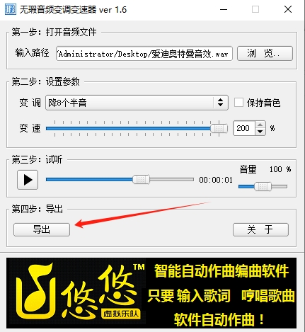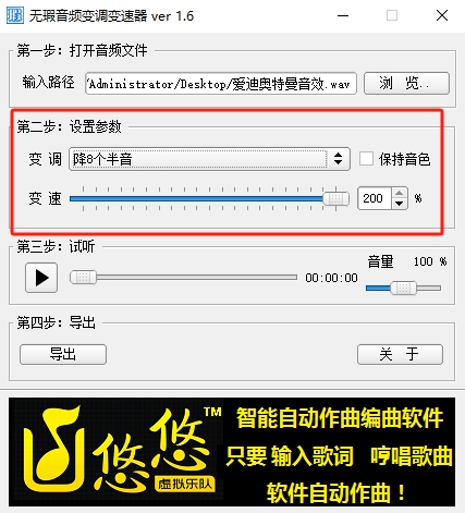 1、该软件可以对音频文件进行变调,变速处理。2、支持12个半音范围内的升降调,支持0.5到2倍变速处理。