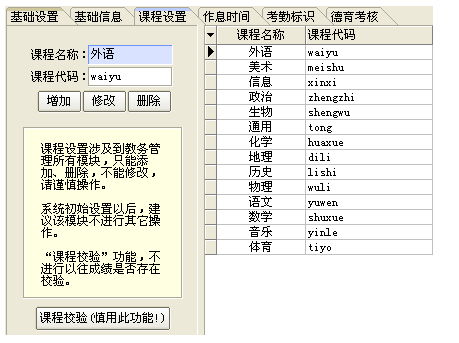(注:课程设置涉及到教务管理所有模块,只能添加、删除,不能修改,请谨慎操作;系统初始设置以后,建议该模块不进行其他操作;“课程校验”工呢个,不进行以往成绩是否存在校验。)