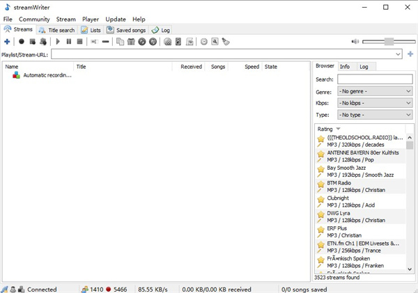 streamWriter这软件真的挺宝藏的,作为一个经常听网络电台的人,我太需要它了。它体积小但功能超强大,能录各种格式的音频,还能自定义时间段去录,特别适合我这种想录深夜节目又熬不住夜的人。最让我惊喜的是它能手动剪切保存的标题,还能自动跳过广告和短歌,这下录出来的歌单就干净多了。而且它支持同时录多个流,甚至能写标签、做后处理,简直是懒人福音。虽然界面是英文的,但操作起来不难,真心推荐给喜欢电台音乐的朋友!streamWriter官方版是一款适用于 Windows 的网络电台智能录音工具,可录制互联网广播电台播放的音乐。软件体积虽然小巧,但功能绝对不容小觑,支持多种格式的音视频文件读取,十分强大!streamWriter还支持自定义时间录制,可以对录音操作指定时间段,还可以对在多指定时间段内的网络电台播放内容进行录制,并具备保存标题的手动剪切功能。需要的朋友欢迎下载使用!