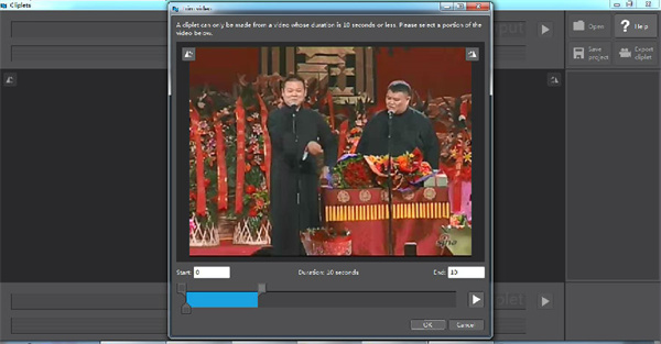 2、这时会自动弹出视频截取窗口(如果视频过短便不会弹出此窗口),输入需要截取视频的开始时间和结束时间(你也可以拖动蓝色条设置开始、结束时间),然后点击“ok”按钮即可。