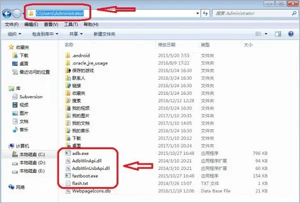 5、将adb工具拷贝到上述路径,如果你上一步显示的是C:\Users\Administrator,就把adb放在C盘->用户(User)->Administrator文件夹;如果你上一步显示的是C:\Users\zhangsan,就把adb放在C盘->用户(User)->zhangsan文件夹