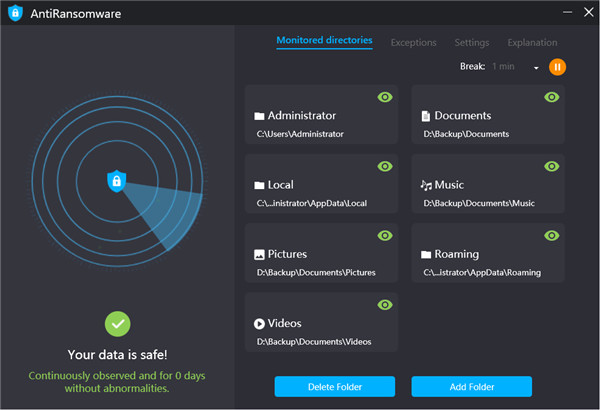 由于Ransomware主要对私人用户文件进行加密,因此AntiRansomware会自动监视四个用户文件夹,其中包含您的照片,文档,视频等。此外,如果将图像等存储在其他位置,则可以选择观察更多的文件夹。