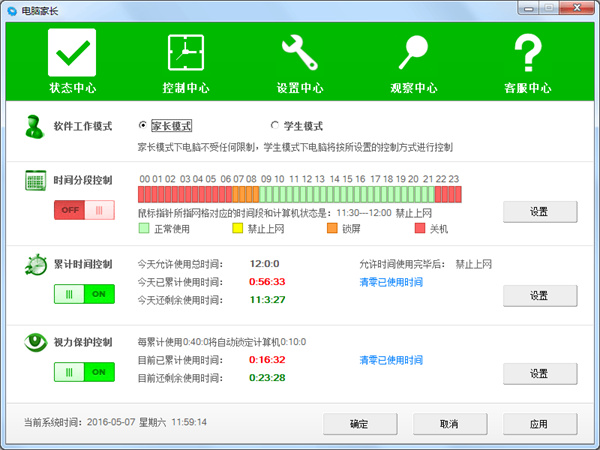 1、方便的用户模式切换功能软件提供了家长模式和学生模式,方便家长和学生之间来回切换。当家长输入软件管理密码登陆后,软件自动切换为家长模式工作状态。