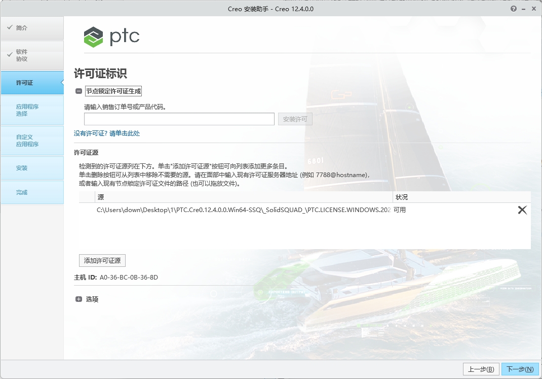 7、将生成的【PTC_D_SSQ.dat】文件拖动到软件界面许可证源处,或者点击添加许可证。然后点击下一步。