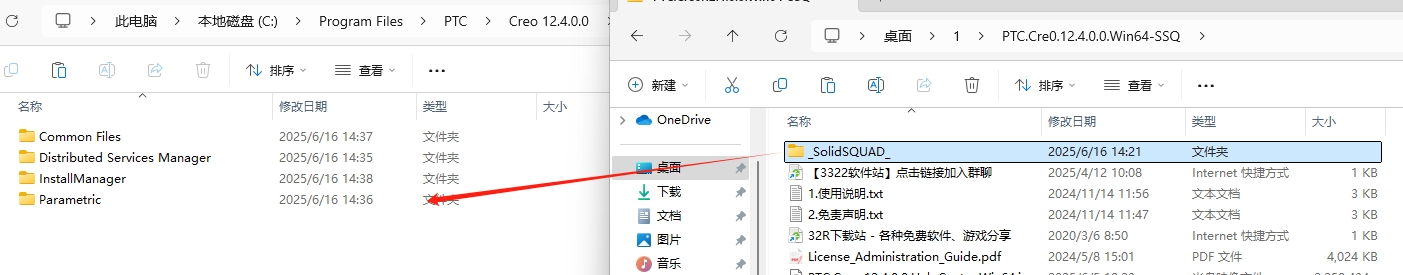 15、将安装包_SolidsQUAD_里面的Creo 12.4.0.0文件夹里面的文件复制粘贴替换到刚才后退的软件安装目录里面去。