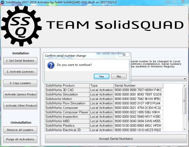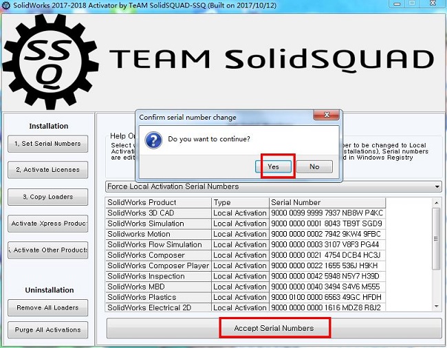 7、然后点击“Accept Serial Numbers”按钮,并弹出提出选项点击“Yes”