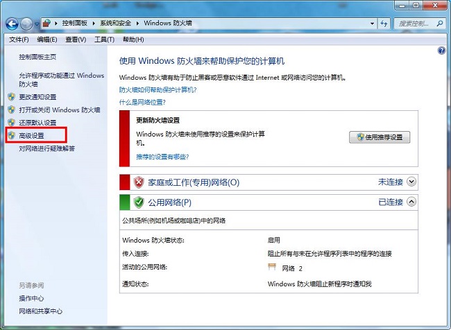 1、打开控制面板-系统和安全-Windows防火墙,选择高级设置
