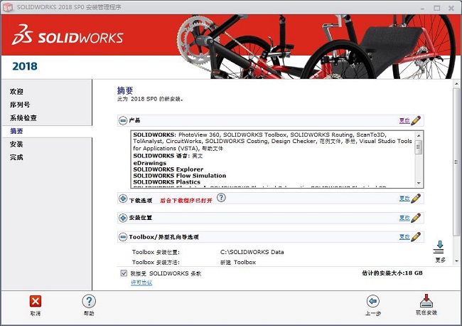 6、进行Solidworks2018安装功能和安装目录等设置,设置完成后勾选“我接受Solidworks条款”,点击“开始安装”