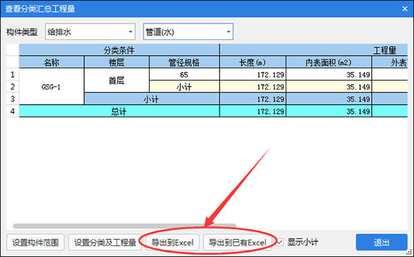 绘图界面:点击【图元查量】左键在绘图区选择图元,下方会出现所选择图元的工程量,可以导出excel。图像分类工程量界面:在工程量界面点击【分类工程量】在弹出的窗口下方有导出excel。