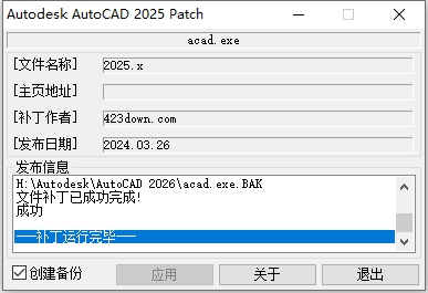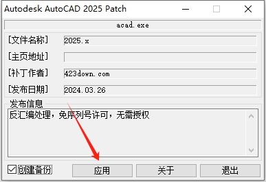 11、点击【应用】开始激活(本注册机虽然写着Autodesk AutoCAD 2025 Patch,但同样适用于CAD 2026版本)。