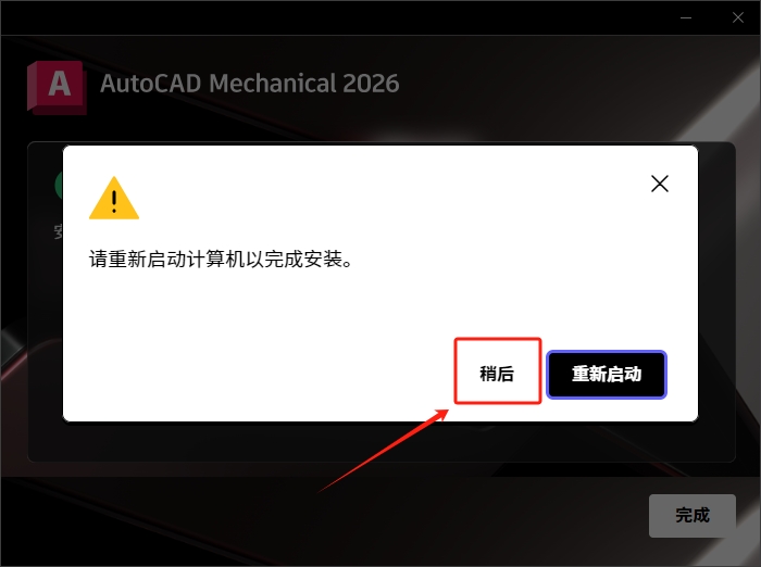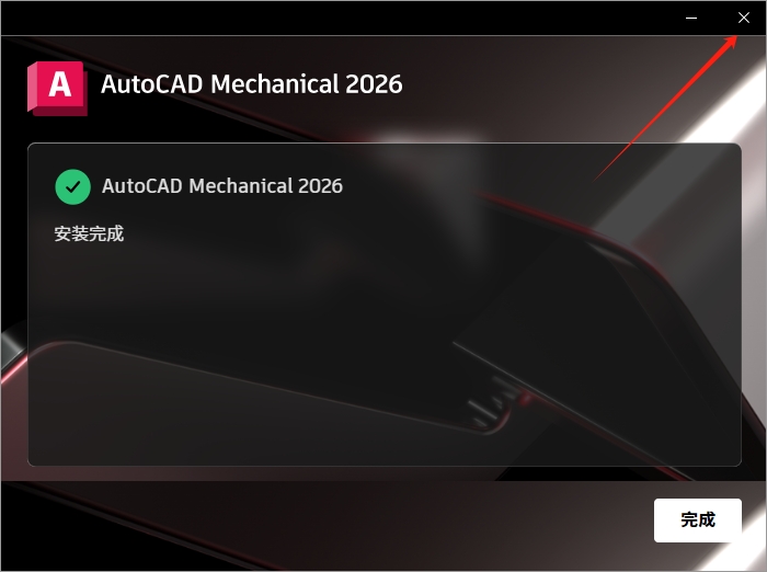 7、AutoCAD Mechanical 2026安装成功,点击【X】关闭,切勿点击【开始】。