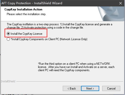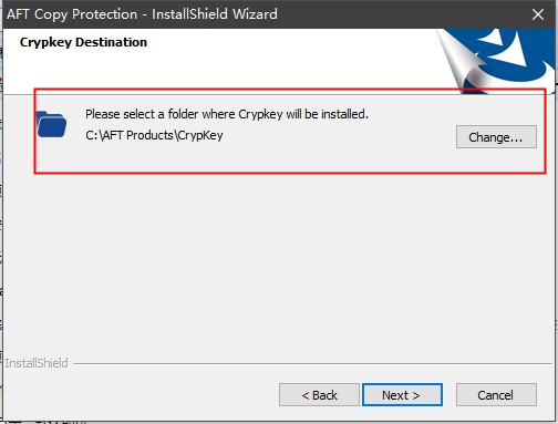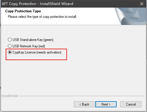注意:这里是AFTCopyProtectionSetup.exe的根目录,不是AFT Fathom 11的根目录!默认位置为:C:\AFT Products\CrypKey