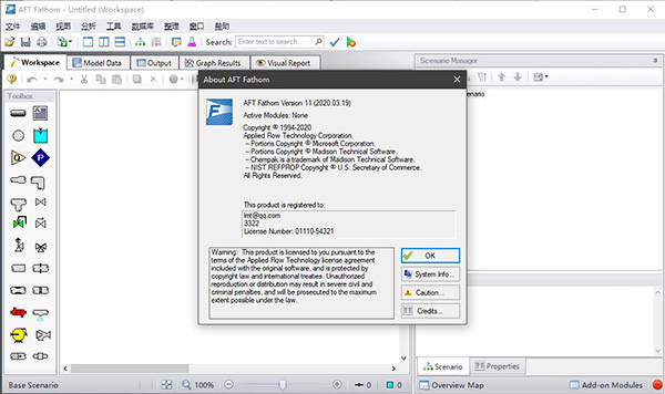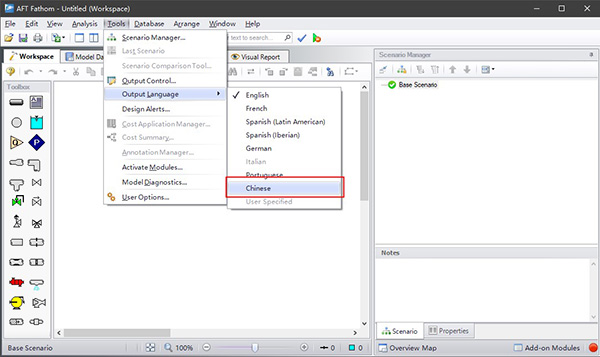 16、运行AFT Fathom 11,默认为英文界面,用户可以通过Tools-Output Language,选择Chinese,将软件更改为中文版!