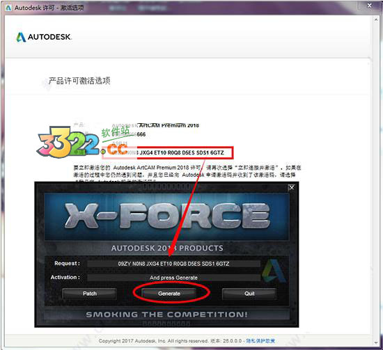 5、将“申请码”复制到注册机的第一项中,点击“Generate”,生成激活码