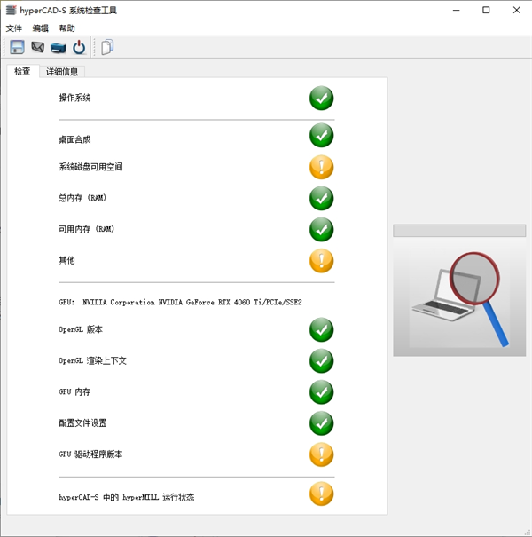 9、关闭后系统自动弹出系统检测页面。如有红色X子的就是不能正常使用,和软件和加密狗 没任何关系,请自行去下对应的显卡驱动,叹号的忽略;